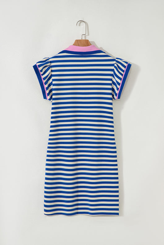 Dark Blue Stripe Print Contrast Collar Split Neck Flutter Sleeve Short Dress